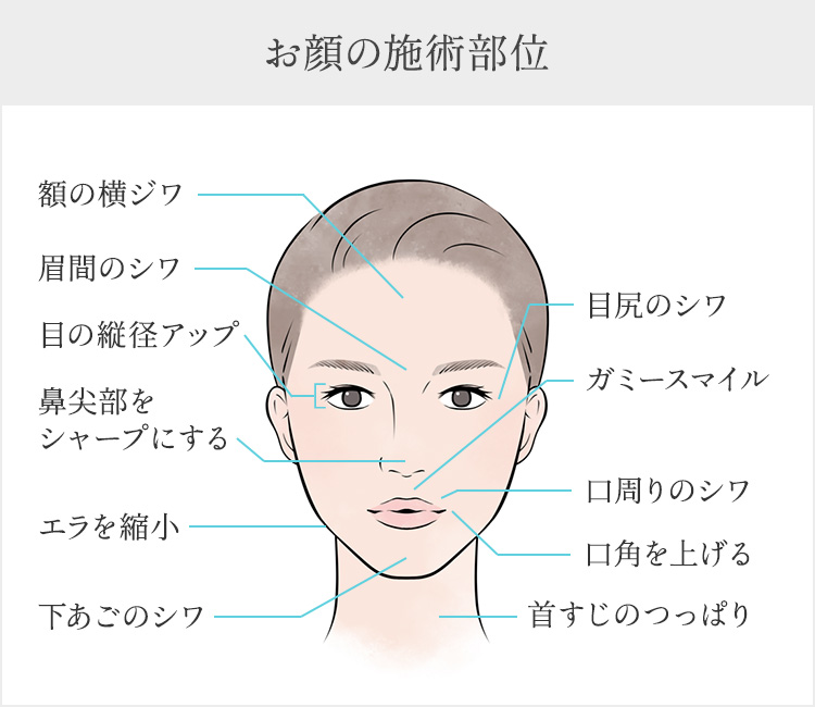眉間やおでこ、目尻の表情ジワの改善や、エラの筋肉を縮小した小顔効果も期待できます。